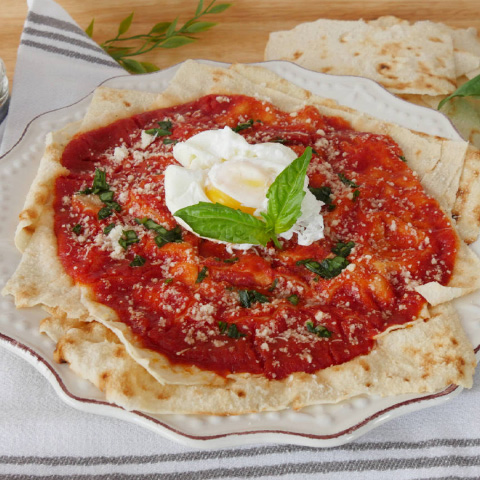 Un piatto semplice che comprende pane carasau, sugo di pomodoro, pecorino e per finire, un bel uovo in camicia sopra a tutto.
